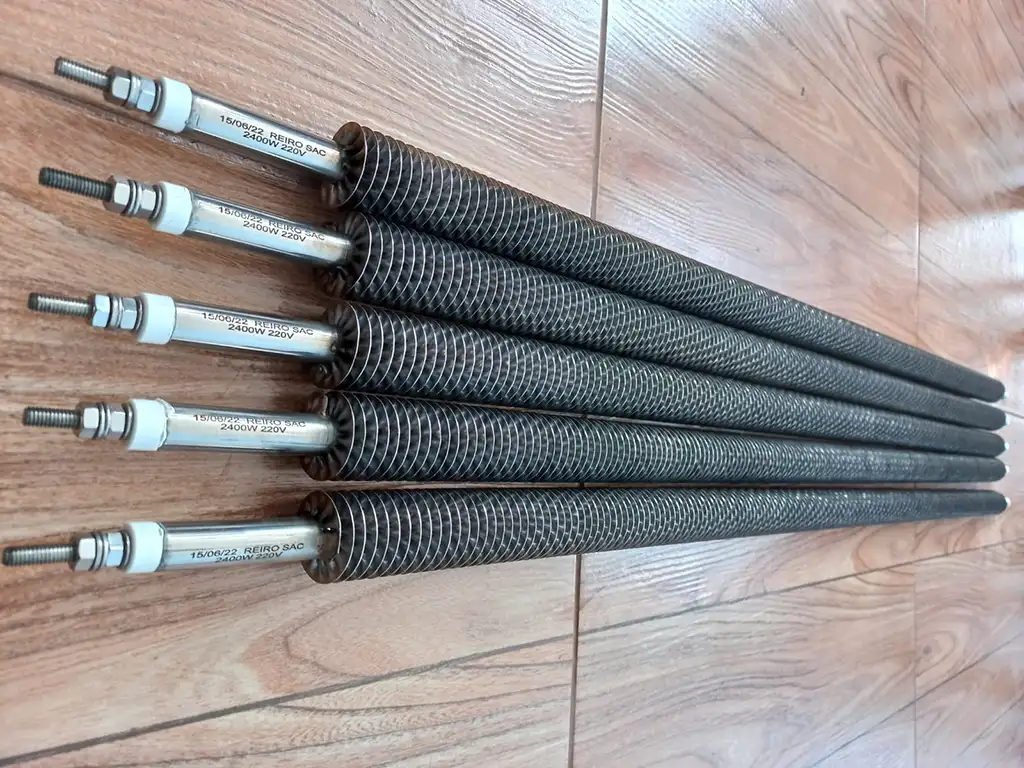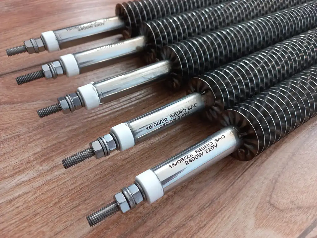 Elementos especialmente estudiados para el calentamiento de gases a temperaturas elevadas. Admiten una temperatura máxima del aire de 400ºC con circulación forzada. La resistencia se dimensiona en función de la velocidad del aire y de la temperatura del mismo. Su aleteado helicoidal construido con fleje de acero inoxidable, le permite soportar altas temperaturas y resistir agresiones de tipo químico.